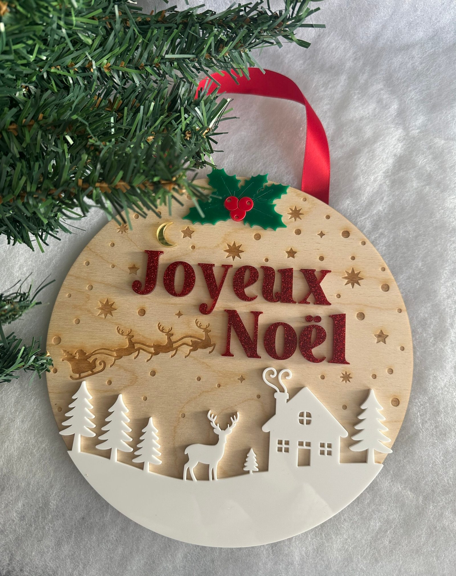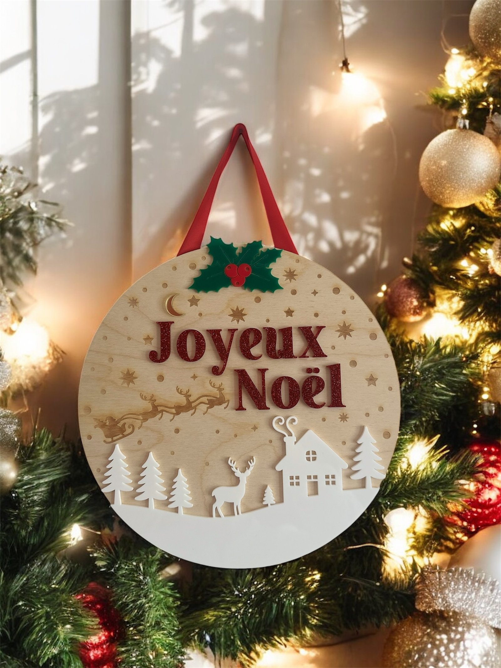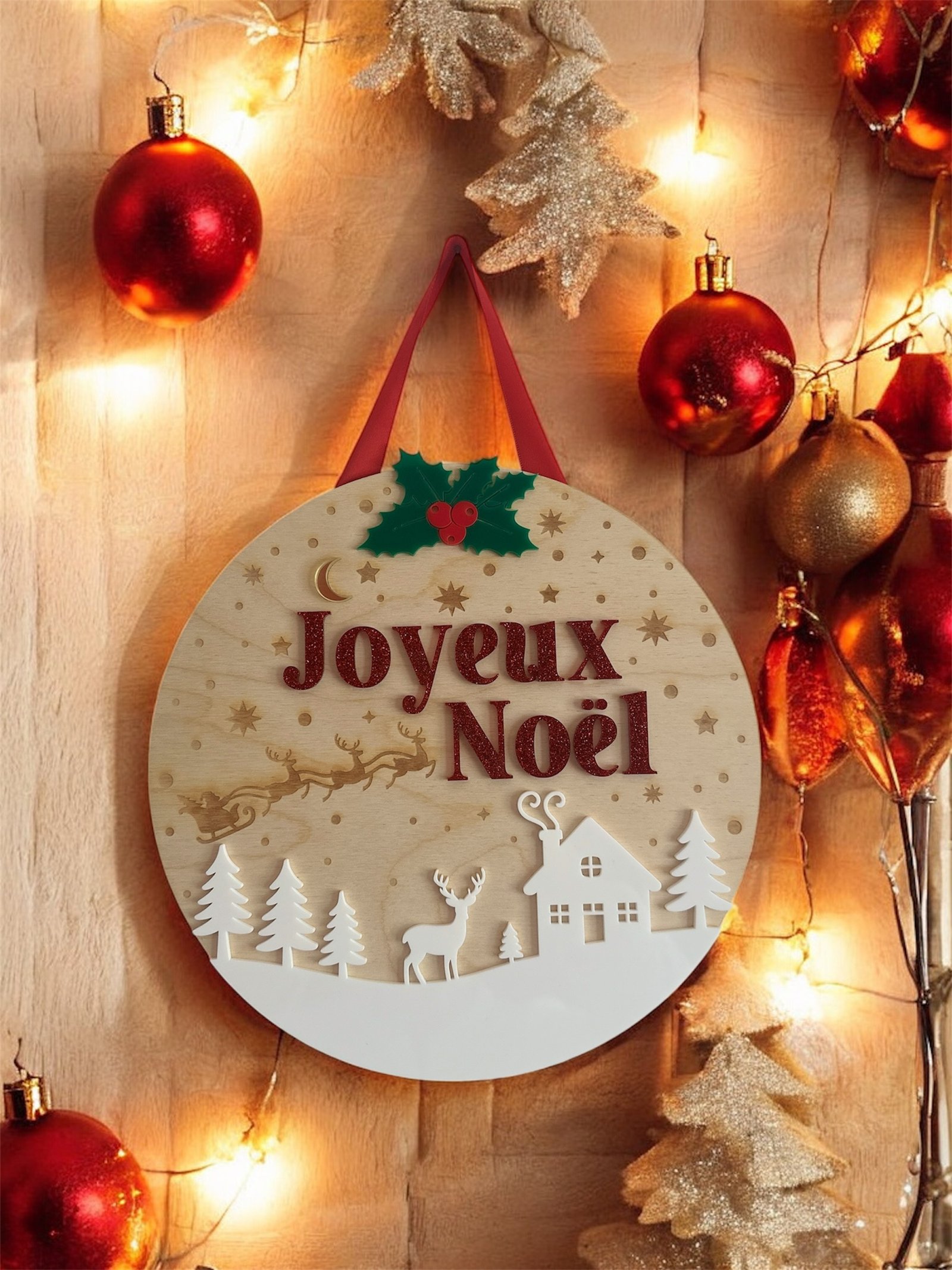 - La phrase « Joyeux Noël » en acrylique rouge pailleté accentue la magie de Noël.